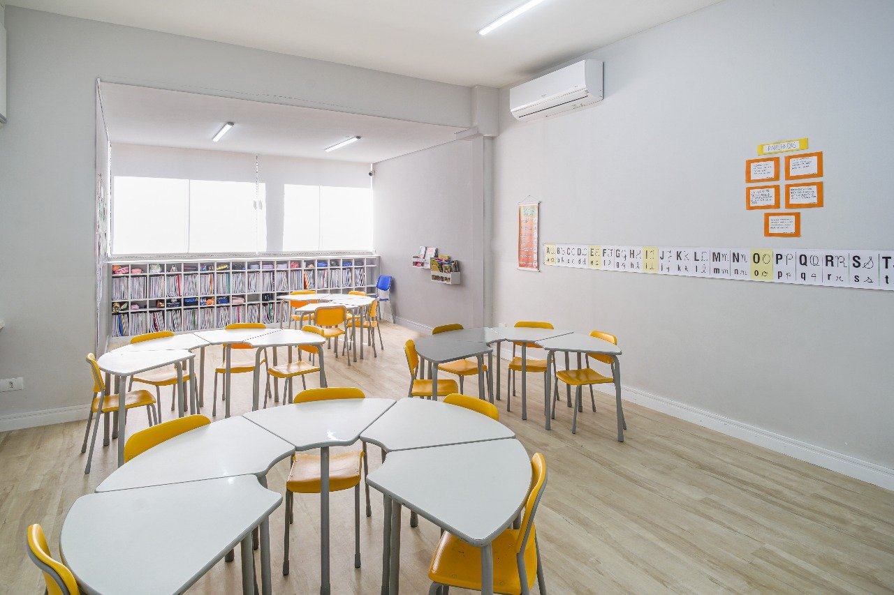 - Salas climatizadas e equipadas com projetores, com mesas e cadeiras ergonômicas adaptadas a cada faixa etária, favorecendo trabalhos em equipe.
